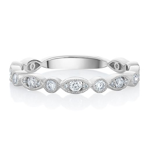14kt white gold round diamond band with milgrain edge.