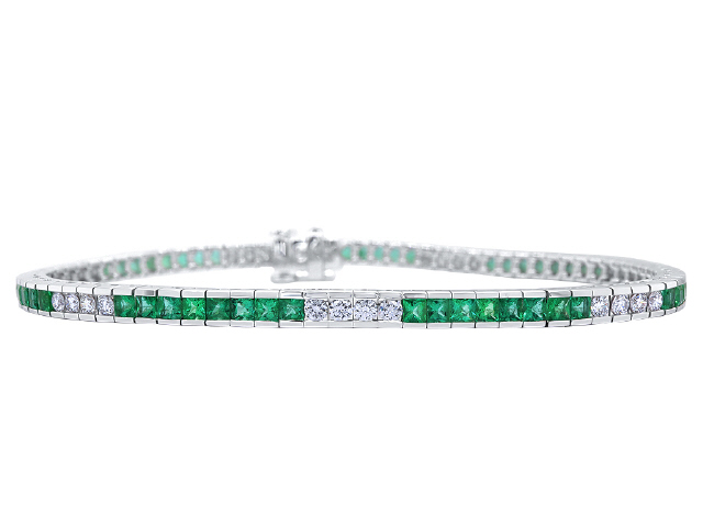 18kt white gold channel set emerald and diamond straight line bracelet.