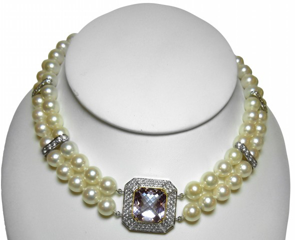 Double strand 17" pearl necklace with 18kt white gold diamond/amethyst center