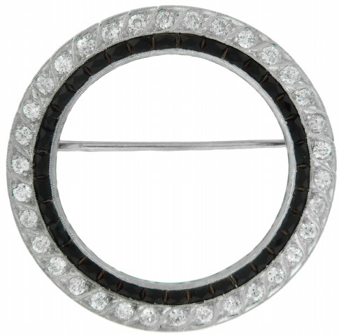 Art Deco Platinum calibre cut black onyx and diamond circle pin