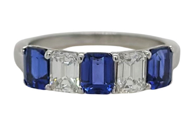 18kt white gold emerald cut sapphire and diamond band.