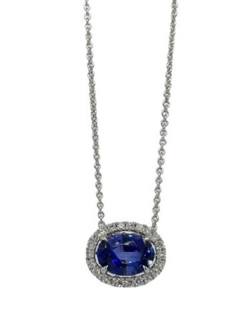 18kt white gold oval sapphire and diamond halo pendant with chain.