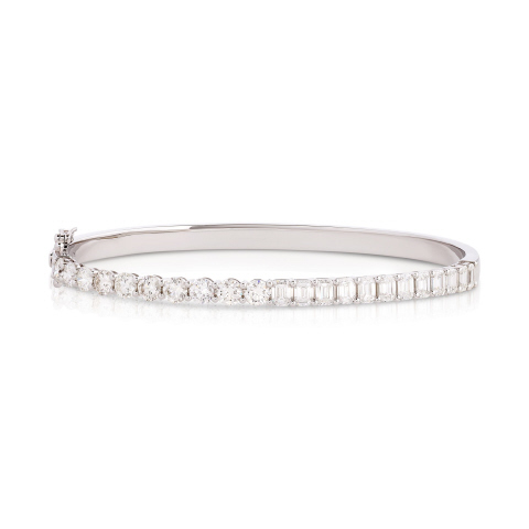 18kt white gold 1/2 emerald cut and 1/2 round diamond bangle bracelet.