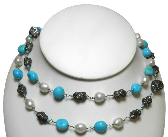 18kt yellow gold & Sterling Silver black diamond, turquoise, and pearl necklace