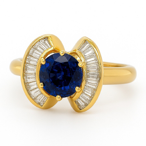 18kt yellow gold sapphire and baguette diamond ring
