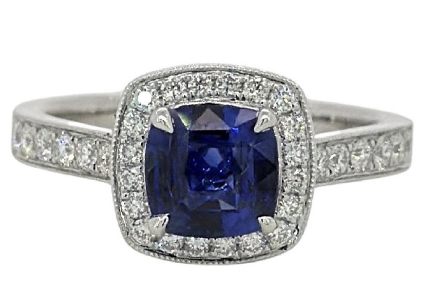 18kt white gold cushion sapphire and diamond ring