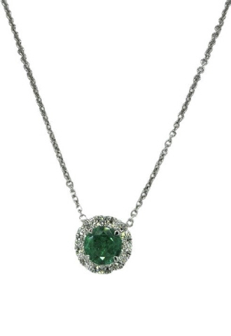 18kt white gold emerald and diamond halo pendant with chain.