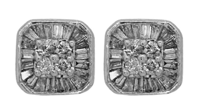 14kt white gold round and baguette diamond stud earrings.