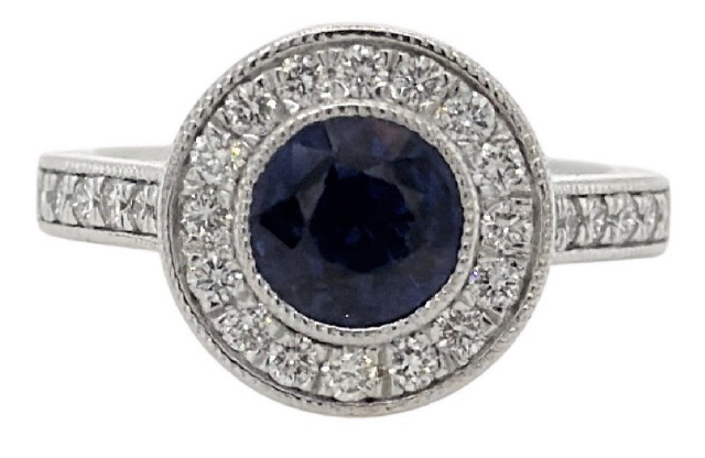 14kt white gold bezel set sapphire and diamond ring with milgrain edge.