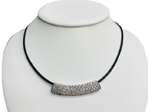 14kt white gold clip-on diamond enhancer on black cord necklace.