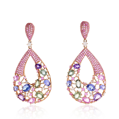 18kt rose gold hanging multi-color stone and diamond earrings.