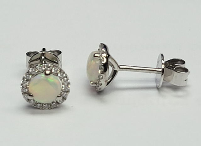 18kt white gold opal and diamond halo stud earrings.