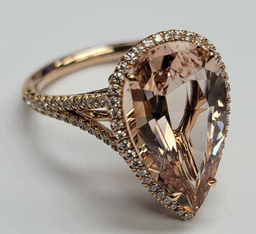 18kt rose gold hand made Pear Shape Morganite and Diamond halo ring.
