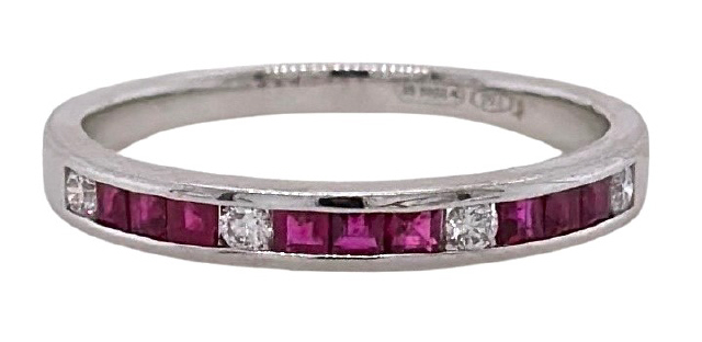 18kt white gold ruby and diamond channel set band.