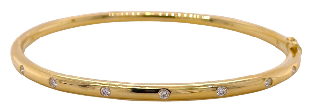 14kt yellow gold bangle bracelet with burnish set diamonds.