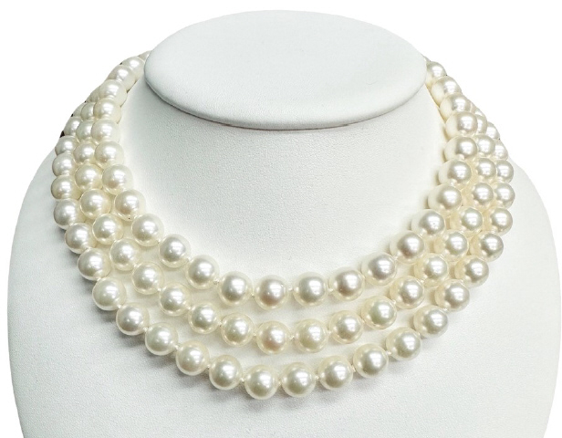 8.5mm Akoya pearl necklace with mysteries. 47.25" overall.