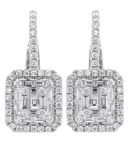 18kt white gold hanging round and baguette diamond illusion halo earrings.