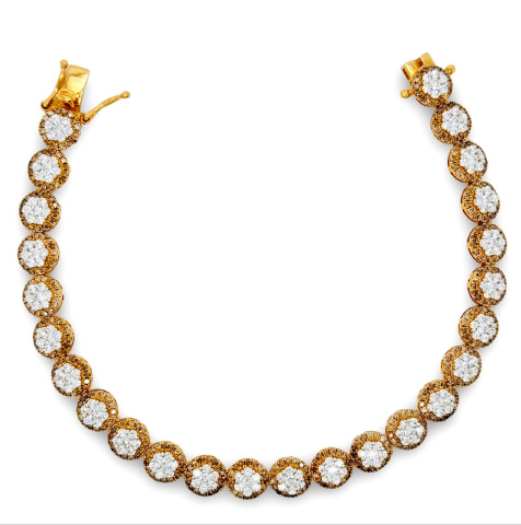 18kt rose gold pave diamond circle link bracelet with white and brown diamonds.