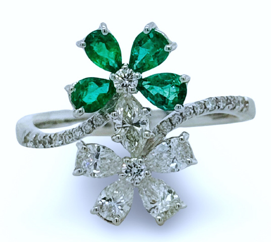 18kt white gold emerald and diamond bypass flower ring