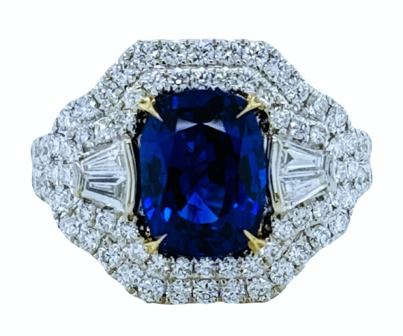 Cushion sapphire 3.23ct GIA Report#2231105511 Tapered baguettes 4/0.16tw G-H/VS Round diamonds 90/1.16tw G-H/VS