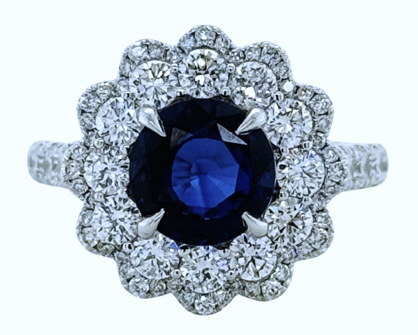 18kt white gold double halo diamond and sapphire ring