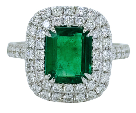 18kt white gold double halo diamond and emerald ring