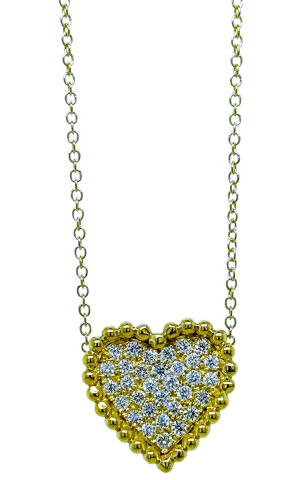 18kt yellow gold pave diamond heart pendant with beaded edge chain