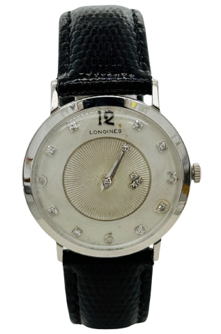 14kt white gold Longines "Mystery" diamond dial watch with black strap