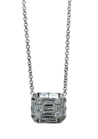 18kt white gold round and baguette diamond pendant with chain