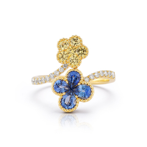 18kt yellow gold blue sapphire, yellow sapphire and diamond double flower ring.