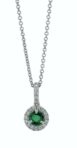 18kt white gold emerald and diamond martini style halo pendant with chain.