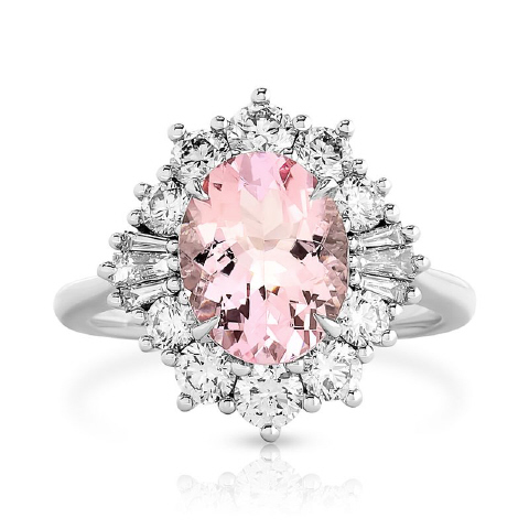 Oval Morganite 2.24ct Baguette Diamonds 6/.14tw G-H/VS2-SI1 Round Diamonds 10/.98tw G-H/VS2-SI1 (Morganite Measures 10 x 8 mm)