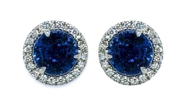 18kt white gold martini style sapphire and diamond halo stud earrings.