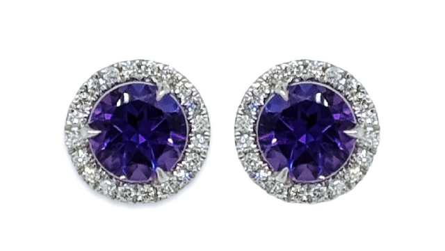 18kt white gold martini style amethyst and diamond halo stud earrings.